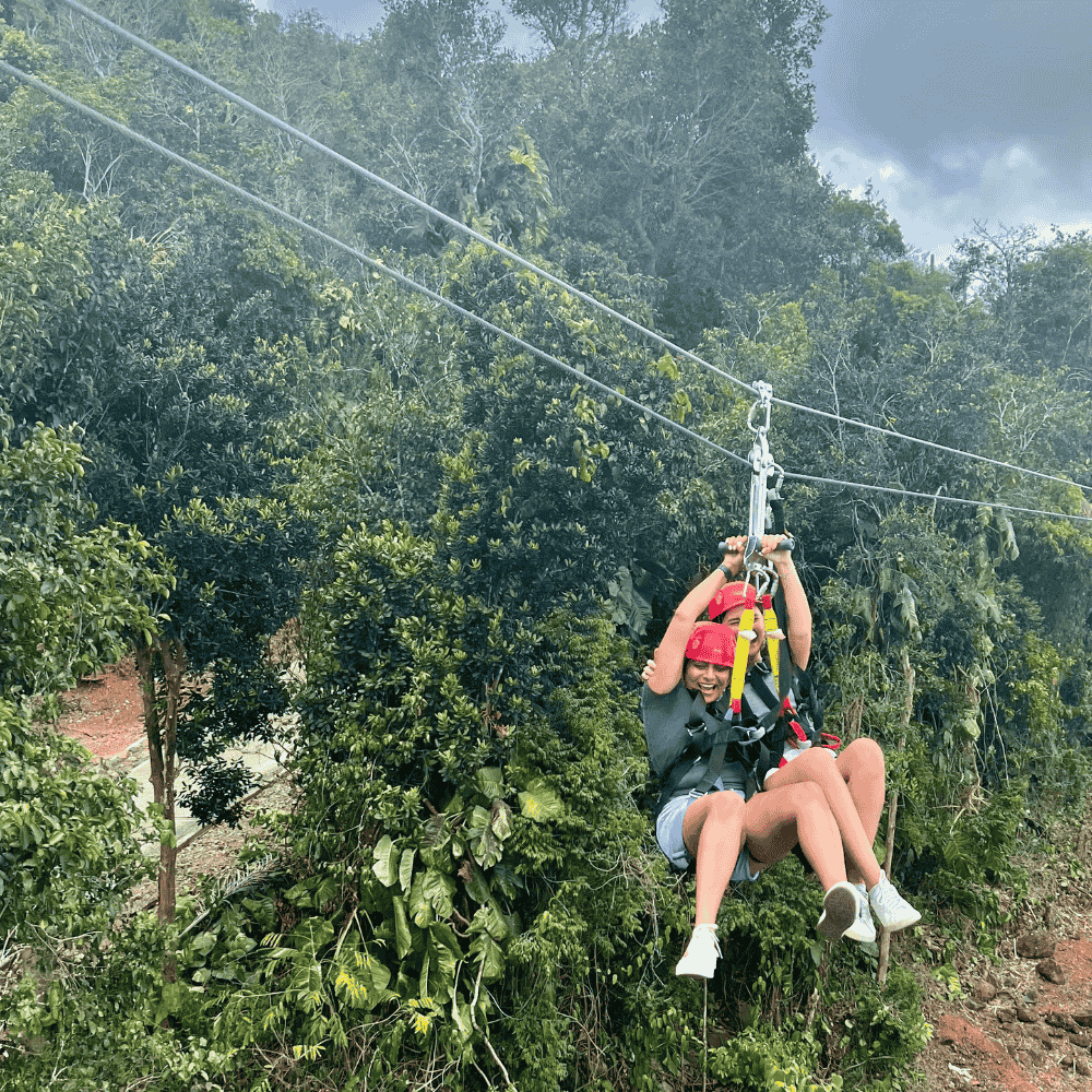 But it’s not just about the physics, it’s about the fun! It provides a totally different experience for parents and kids to soar through the rainforest together. When you zip tandem, you have the choice of zipping side-by-side or with the smaller guest between your legs.